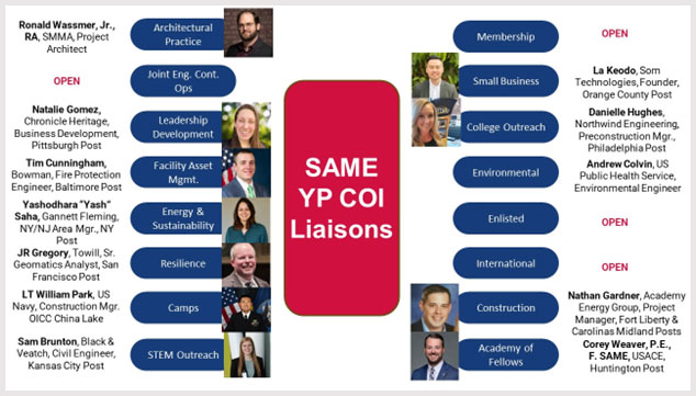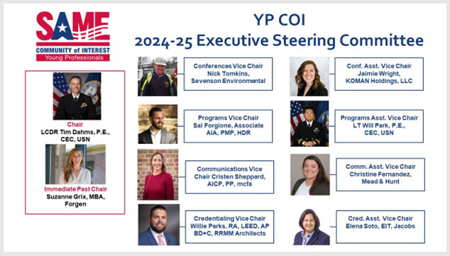 The Mission of the SAME Young Professionals Community of interest (YP COI) is to be an advocate for and engage young professionals in support of the SAME Strategic Plan through outreach, training, networking, and recognition. The COI provides educational programming, hosts networking activities, promotes leadership and engagement opportunities, and emphasizes recognition of young professionals within the Society.